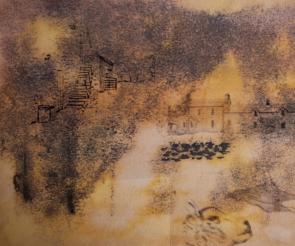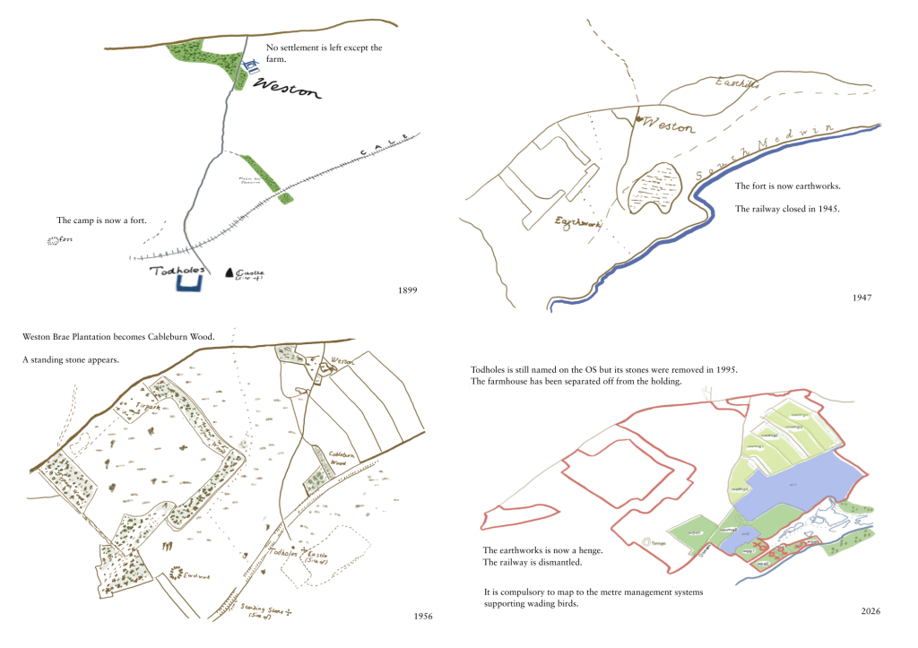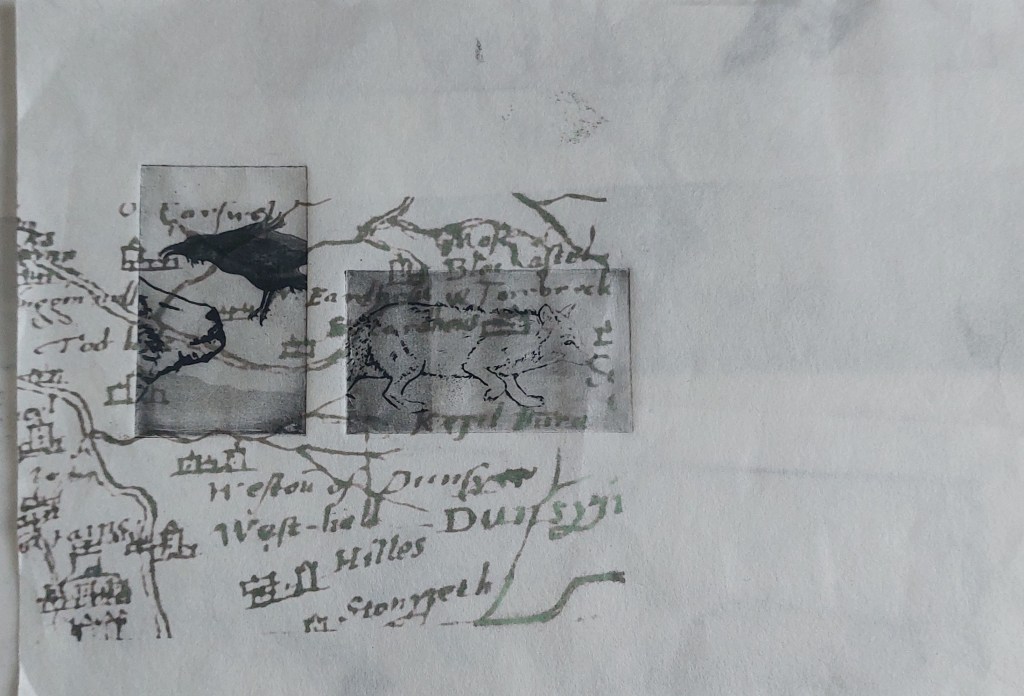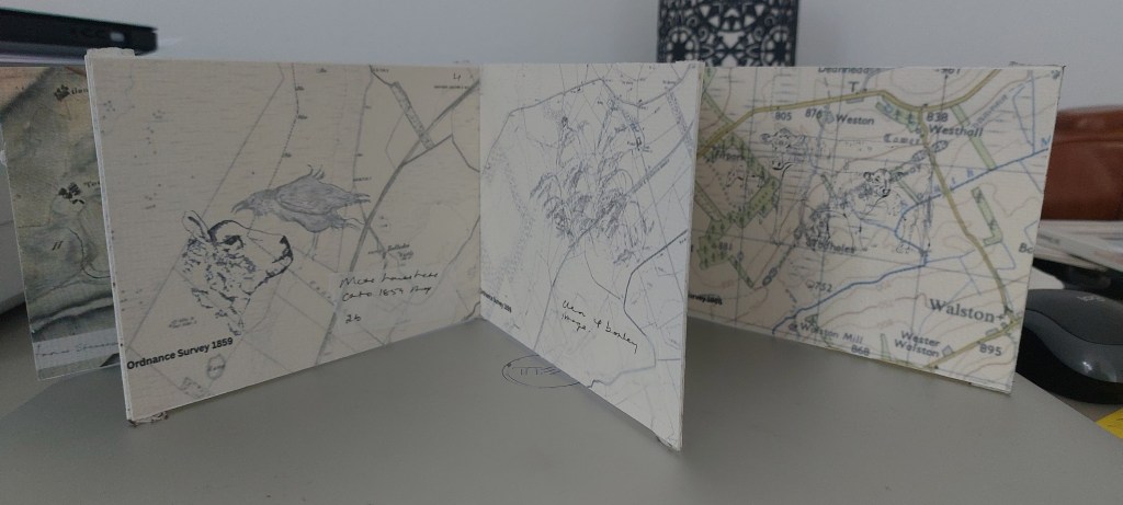 I thought about the history of the place and realised this could be portrayed through maps and the different styles they had taken over a very long time, together with what was chosen to depict on them. The valley where the farm is situated has been steadily depopulated since the eighteenth century and many buildings have fallen into disuse, dilipidation, ruin and demolition. The stones from them were used to build dykes during the period of Improvement in the eighteenth century as enclosure came in, farms were consolidated into bigger and bigger units and rural labourers ‘cleared’ and relocated to the cities.