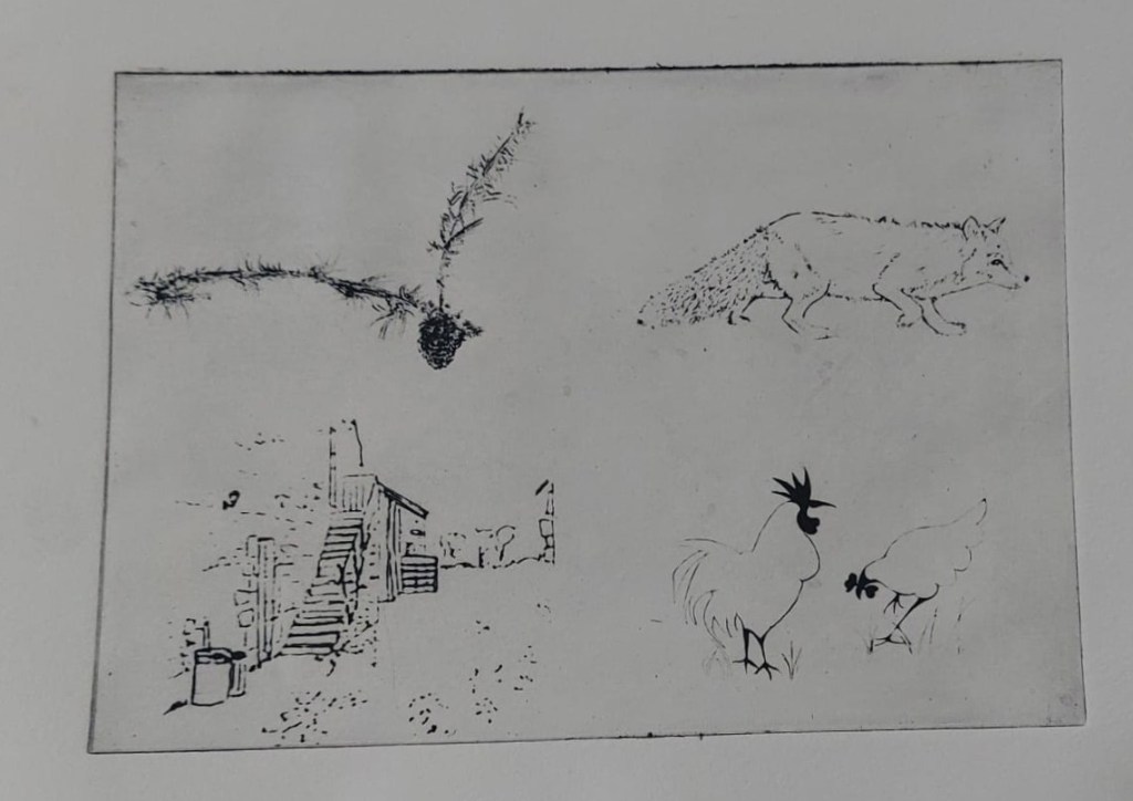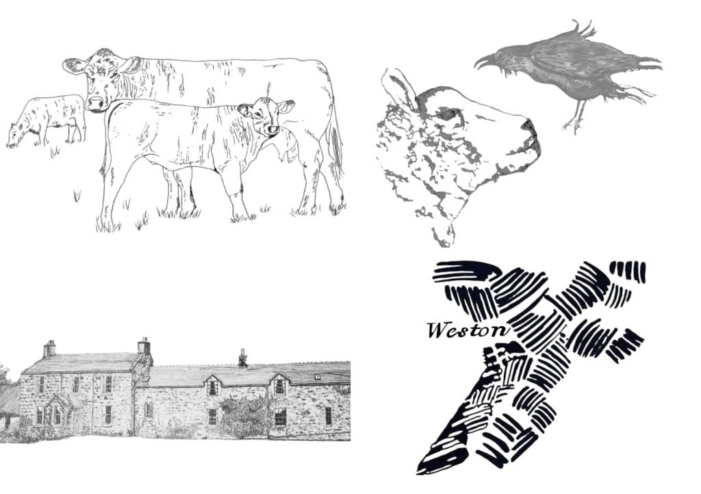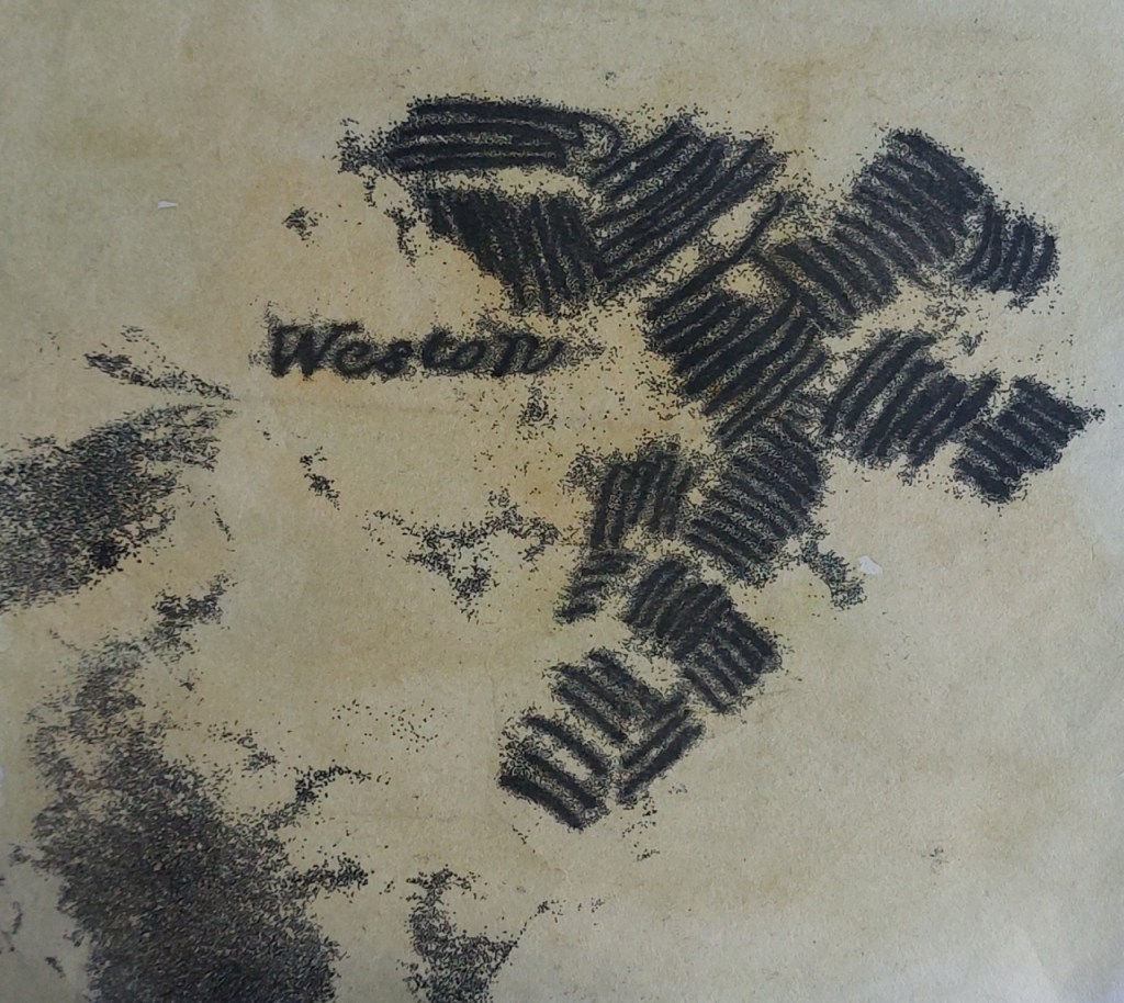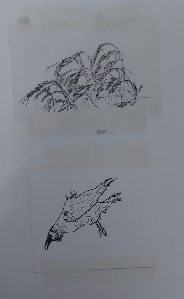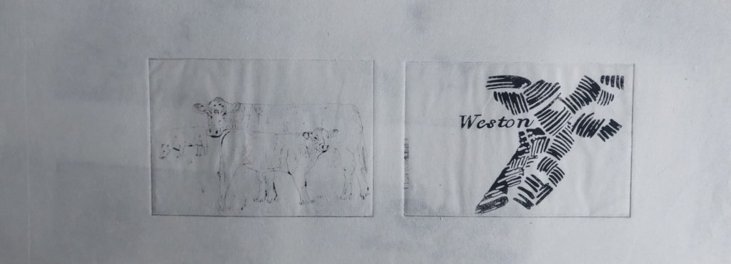 I experimented with the images I had drawn and decided not to use a couple of them as I didn’t think they would come out well on a solar plate. I took a new drawing from monoprint I did showing ridge and furrow and the name Weston, scanned it and digitally cleaned it up using Sketchbook to make an acetate. In the end, I selected eight images, two more than the original six I planned.