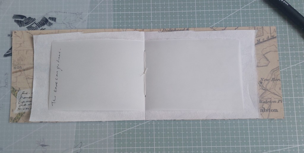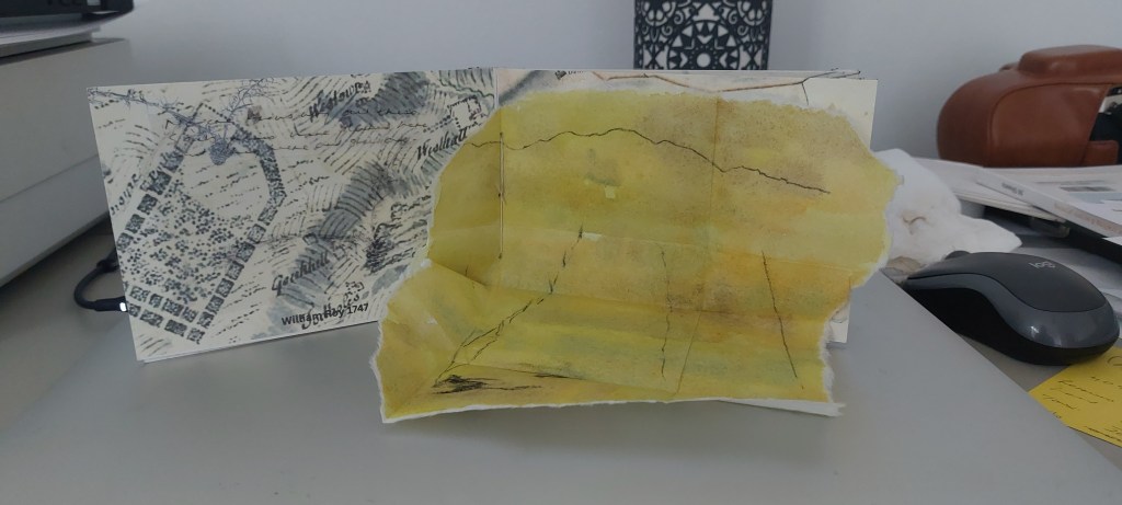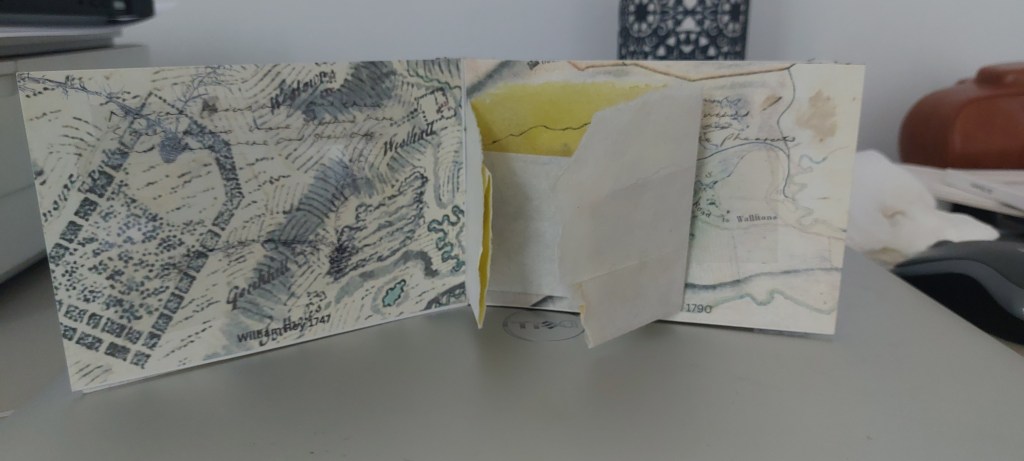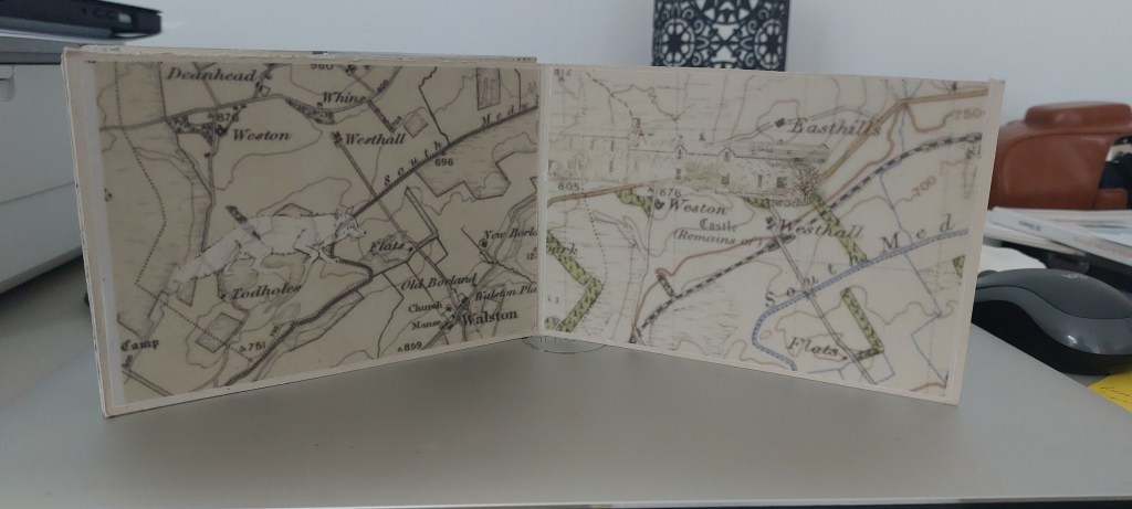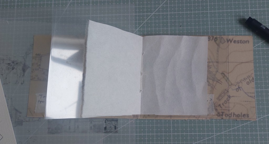 I spent two days working out the best way to assemble the piece. I planned to cut up the acetates I had used to make the plates but, after making another maquette using previously rejected OS maps to see if I could actually stitch throught it, I abandoned this. With considerable difficulty I found I could stitch the inserts in but despite scoring and flattening the fold with the bone folder I then discovered the pages would not shut property. I then reverted to my first plan of using tracing paper.