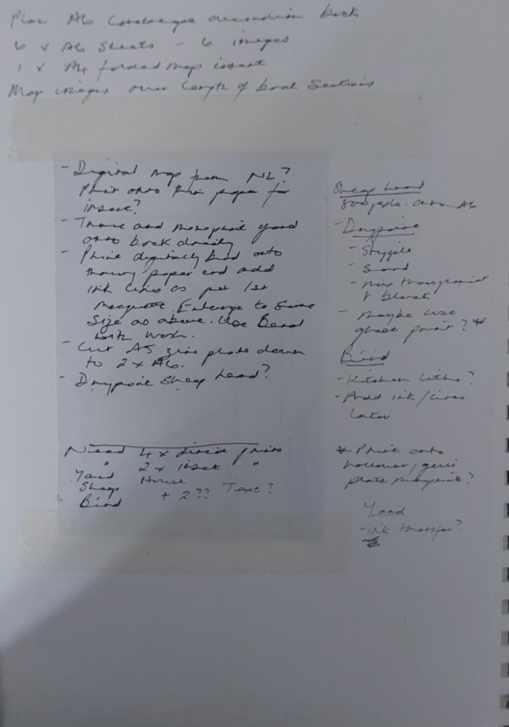 I then had to decide finally in what order the images would be presented and which maps they would sit on top of as I couldn’t make the plates until I had done this. Also, although I could have made the process simpler by cutting the prints themselves horizontally, rather than cutting the two A5 plates into eight separate plates, this would mean the plate marks would not sit symmetrically within the book. Since the printmaking is a major part of the project, it seemed important to make clear that each image was a separate work in its own right.