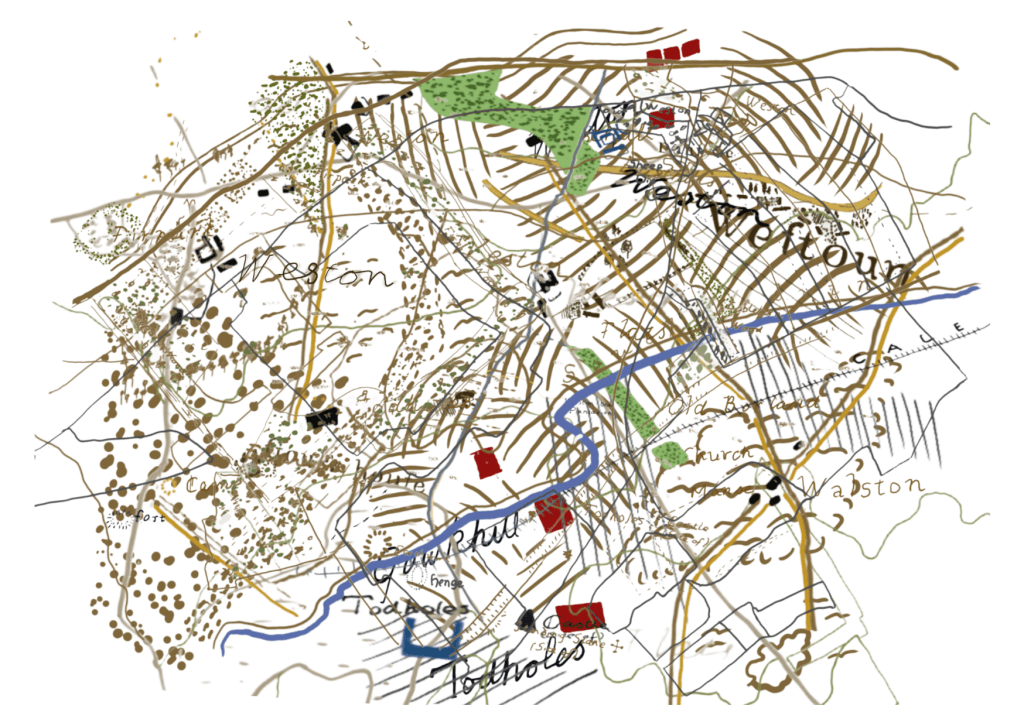 The oldest is dated 1596 and I found an estate map dated 1790. From the middle of the nineteenth century Ordnance Survey began mapping. After careful consideration, I narrowed the available maps down to a provisional six and cropped them to make the farm the main focus.