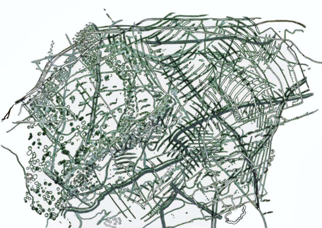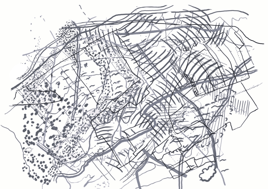 Meanwhile, I began experimenting with overlaying the drawn map images using Sketchbook, Canva and Adobe Light room and became quite excited about the results. It turned out that my photographs of linear patterns on the ground taken in the first two weeks at the start of the course were re-surfacing. I am considering either making a cover with one of them or a separate piece.