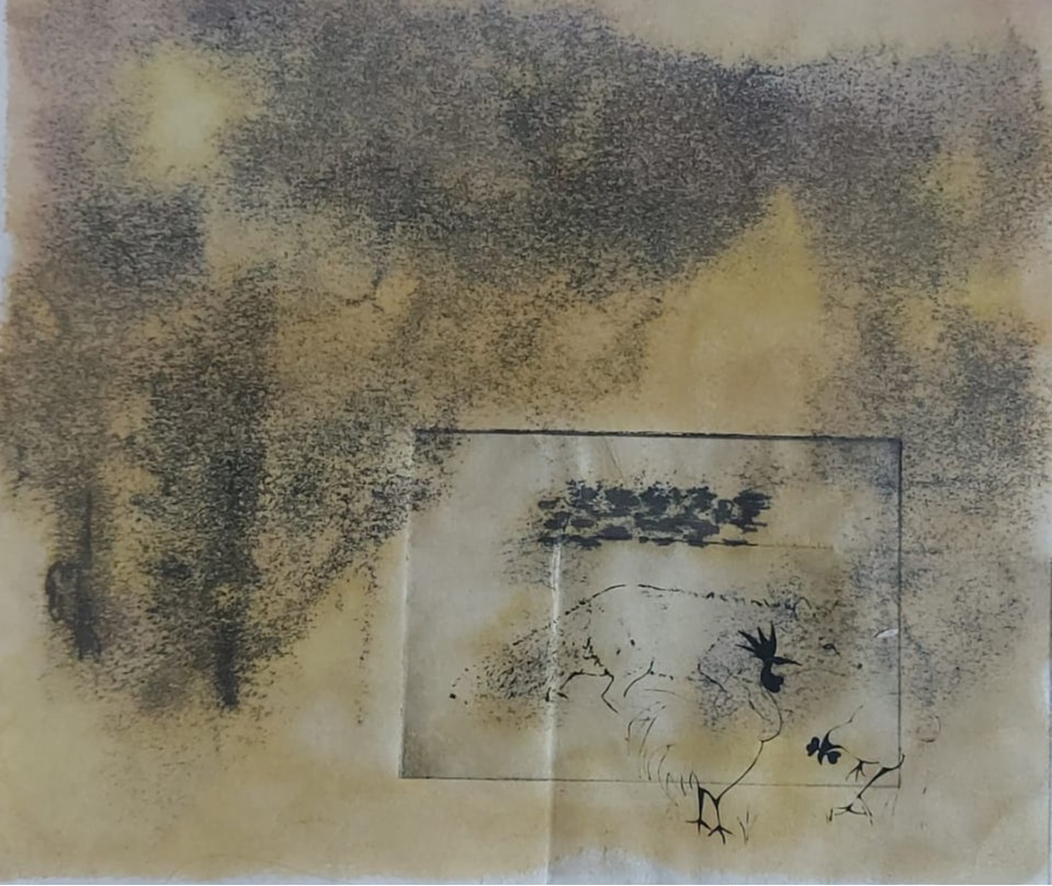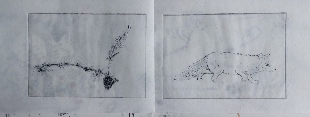 I had started by wanting to insert images on a transparent surface, maybe with tracing paper but then began researching the thinnest Japanese papers that would take intaglio printing – having experimented with it in the first semester, I knew the tracing paper could not handle this without buckling. After trying a sample pack of papers, none of which were standard A4 or A5 so would not fit in my printer and having re-sized all the images to fit, I bought a 10 m roll of Washi Hosho and made the monprints above. It turned out that while my own rotary trimmer would cut it, the trimmer at Gracefield would not without damaging the paper.