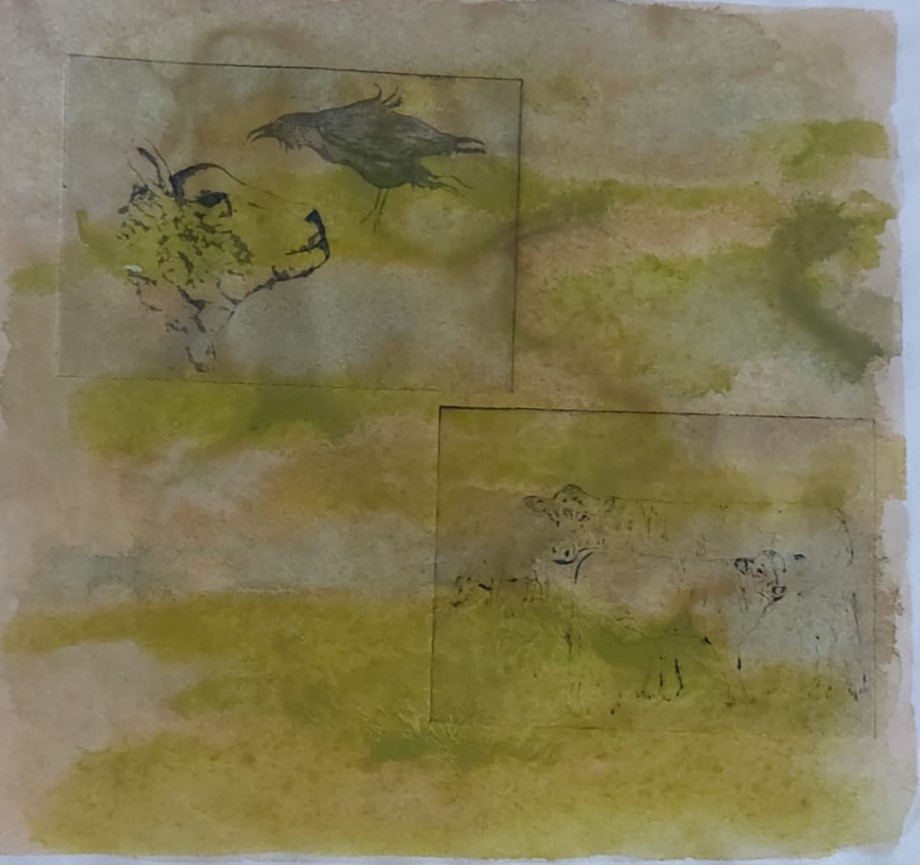 Before I could do this, I began to wornder if I hadn’t been bold enough. Also, I was getting very tired of the finicky work involved in the tiny A6 book. I decided to experiment further, using monoprint, watercolour, gouache, conte crayon and ink to make a composite and more abstract image of the book contents..