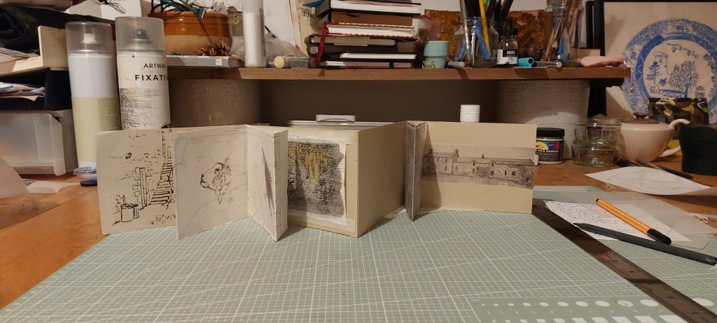 I spent th6 weeks working on the artist’s book and have just about worked out the format and layout and completed seven drawings to make solar plates for the inserts which I will sew in once the book has been printed. I will make the plates this week. I also spent time shopping for the surface and was undecided about the colour but decided on white in the end as the prints may come out clearer than on buff.