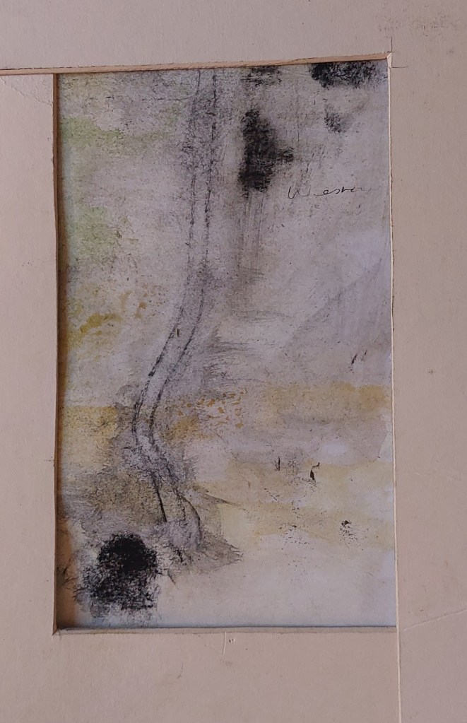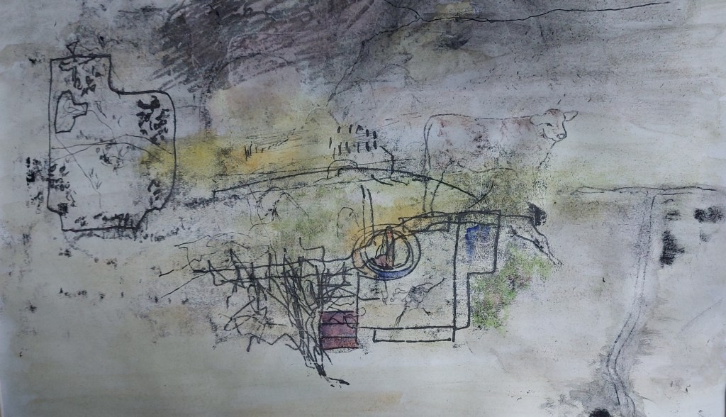 After a productive group meeting at college, I felt I hadn’t been bold enough. Also, I was getting very tired of the finicky work involved in the tiny A6 book. I decided to experiment further, using monoprint, watercolour, gouache, conte crayon and ink to make a composite image of the book contents..