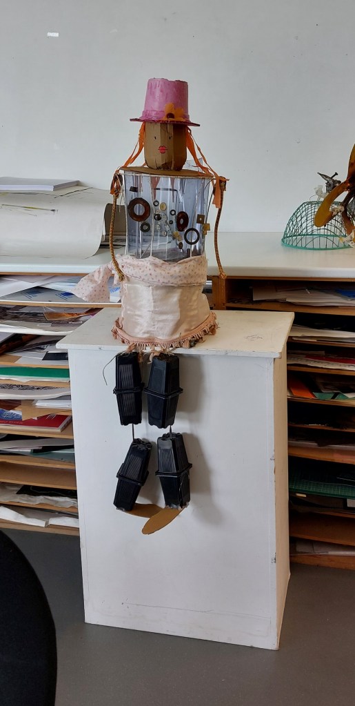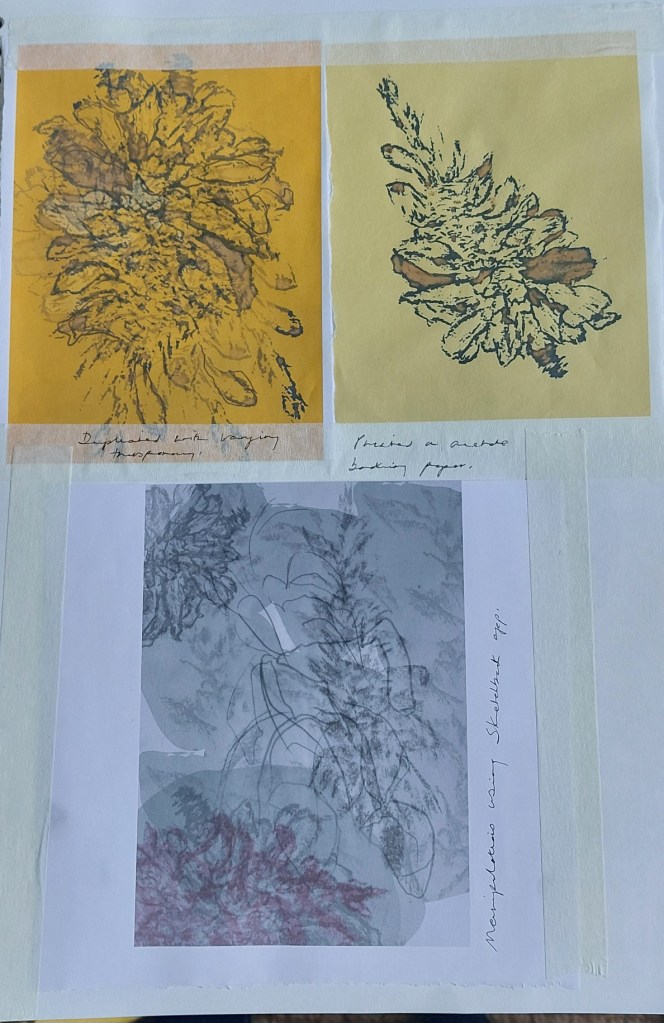 Using gelli plate with acrylic paint and sheets of newsprint inked with etching ink and drawn on reverse to make monoprints.