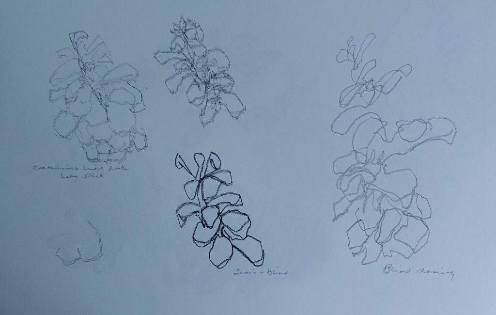 Continuous, blind and semi-blind drawings with pencil on long stick.
