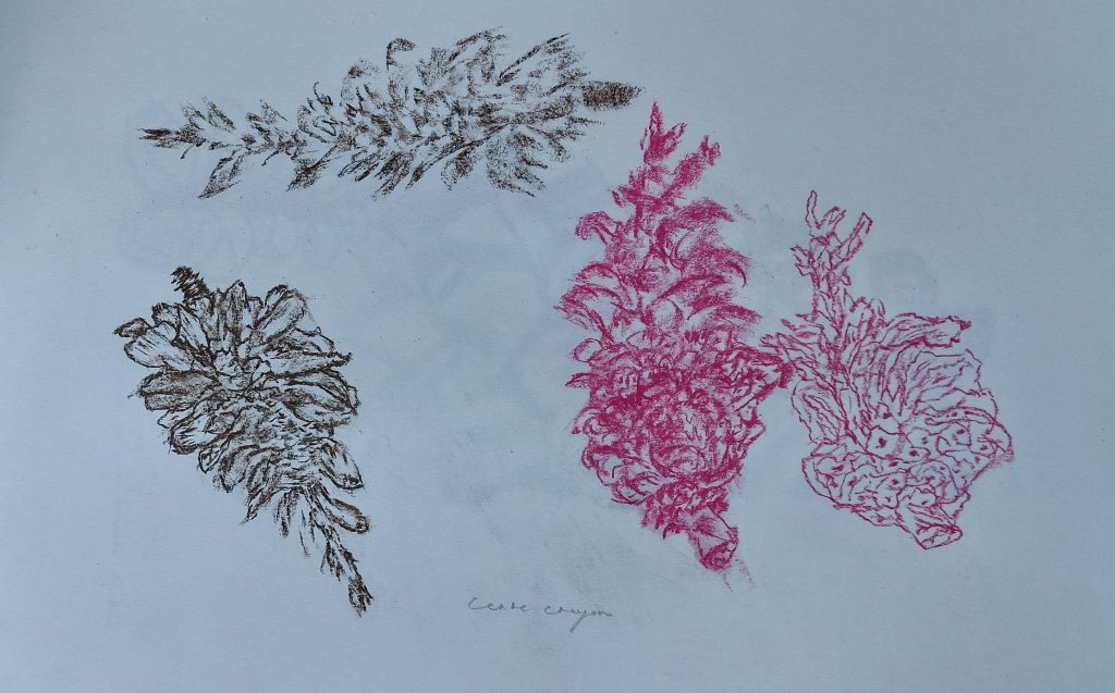 Monprint from drawing on reverse of black inked newsprint onto sketchbook.