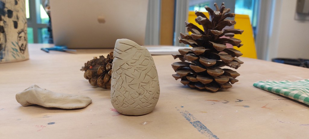 Clay on right formed into egg-like shape, wetted to make smooth, top shaped to resemble tip of cone. Hole carved into base to prevent explosion in kiln. Asymmetric diamond-like shapes incised. Clay on left shaped to resemble scale.