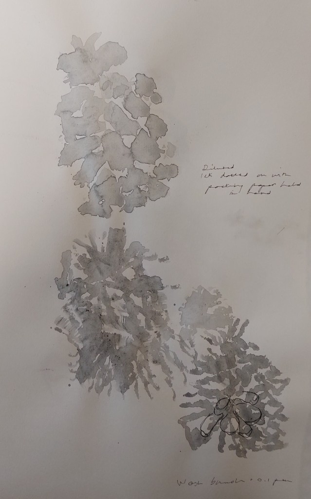 Experiments with diluted ultramarine drawing ink applied with 3/4″ flat wash brush. Graphite sketch.