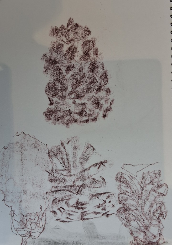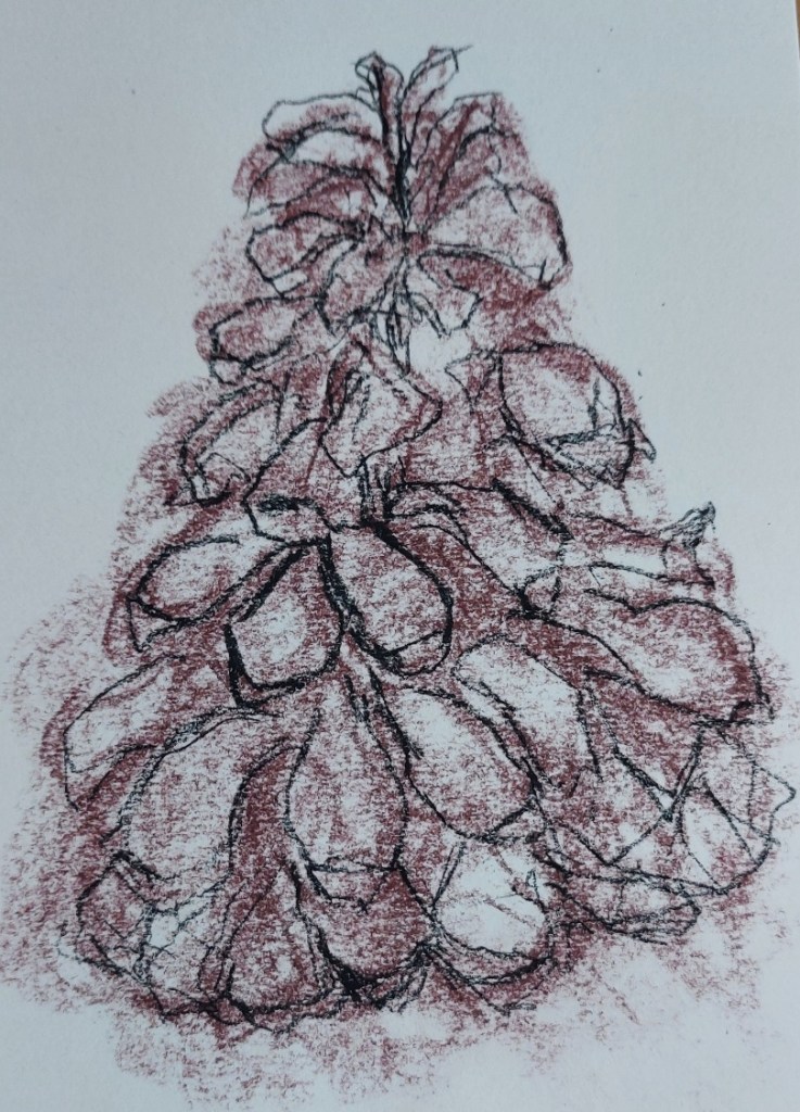 Began really looking at the spirals making up the scales on biggest (female) cone end on. Started with pencil inside 15 cm square frame then just went a bit mad with conte crayon – black, sanguine and yellow. Spirals may need to more carefully calculated/accurate but feel I’m getting somewhere. Trying to stay within 15 cm frame for printmaking.