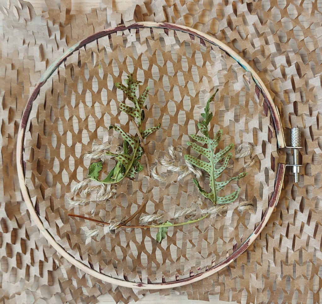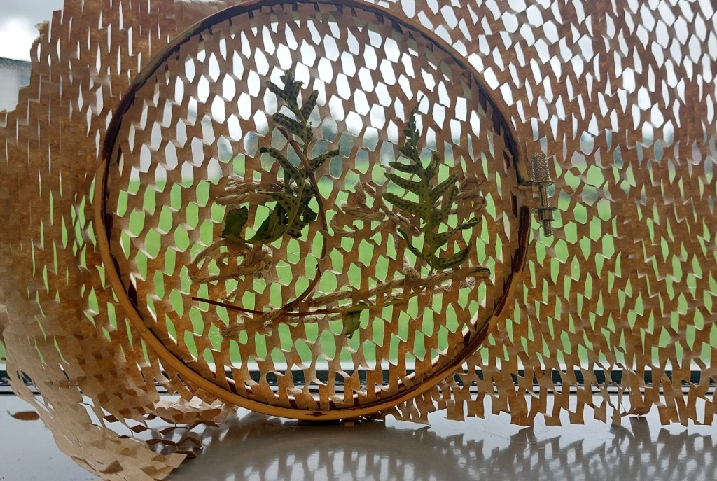 To interpret the object in textile I brought in paper packing material and hemp garden twine, both natural materials. I selected them to mirror the repetitive patterns of the cone, its rough texture and its organic composition. Using a large darning needle to stitch the twine through the holes in the paper like tapestry wool on canvas. It was necessary to use an embroidery hoop to keep the surface flat and even – there was a risk the paper would break with the pressure applied by i 1nserting the hoop but it proved strong enough. The results were mixed. The twine was a little too thick to make the stitches I intended and it’s weight was out of proportion to the delicacy of the paper, strong though it was. It was difficult to get it sufficiently taut without distorting the surface. I tied flat reef knots in the reverse but this made the stitches look bulky. The monochrome brown on brown was what I was looking for but thinner twine or even cotton string would give a more delicate effect and be easier to work with. Another stage might be to wrap lighter embroidery thread around the string or twine to show highlights/variations in tone.
