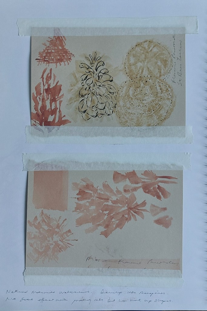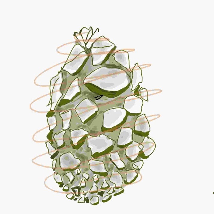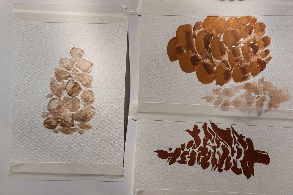 In contrast to the rather crude, stylised gouache paintings on the left, the fineliner/gouache wash drawings of extreme close ups of the cone’s scales on the right were deliberately graphic and literal in order to continue exploring techniques. I found them very unsatisfying but doing them helped me clarify the kind of direction I do not want the work to take.