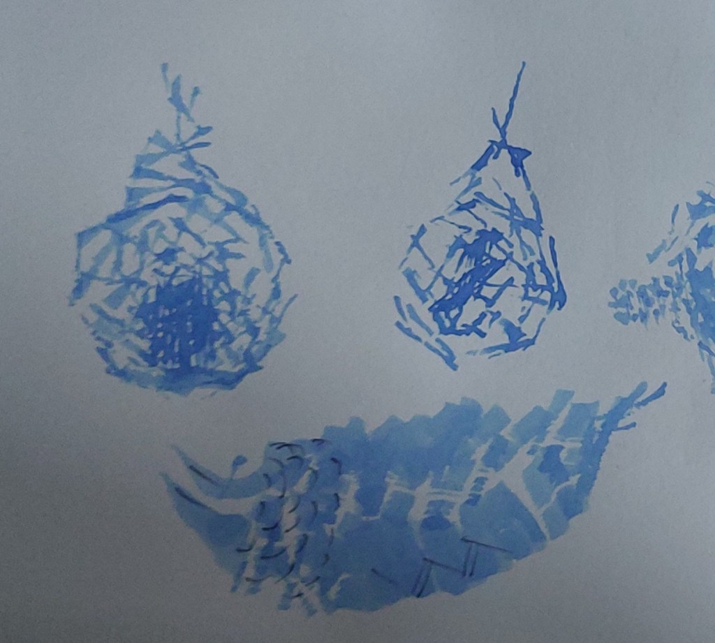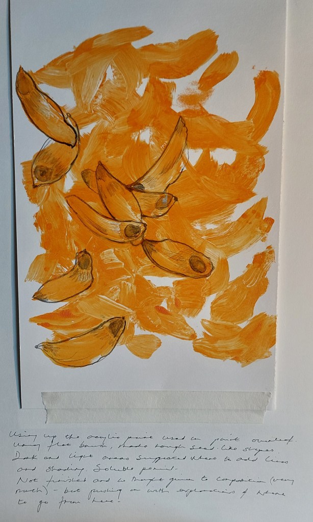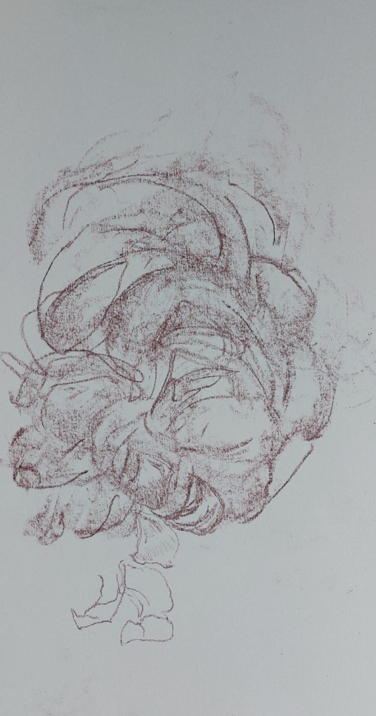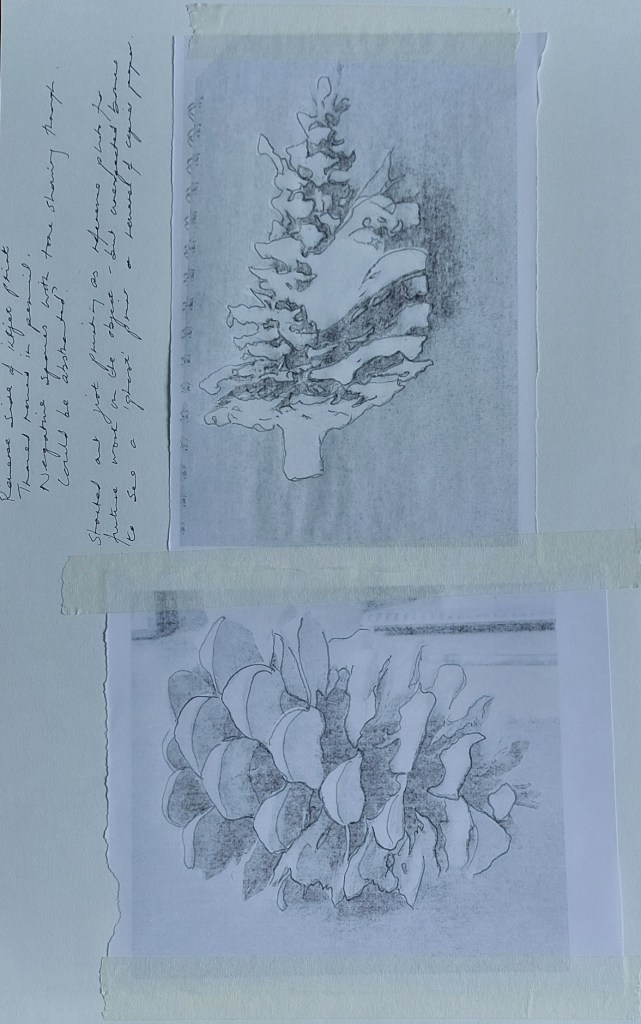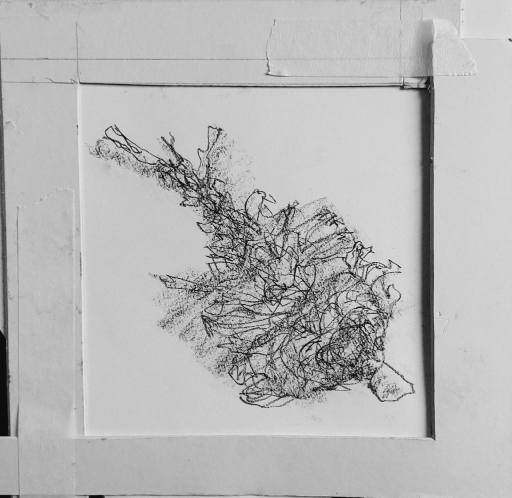 Found earlier drawing that fits within 15 cm square plate and copied using fineliner pen at same scale. Might add seeds. Hoping to make a fresh image though interested in the possibility of a sgrafitto approach to etching. However, chose this mainly as a backstop in case I don’t manage to come up with anything else for the workshop on Saturday.