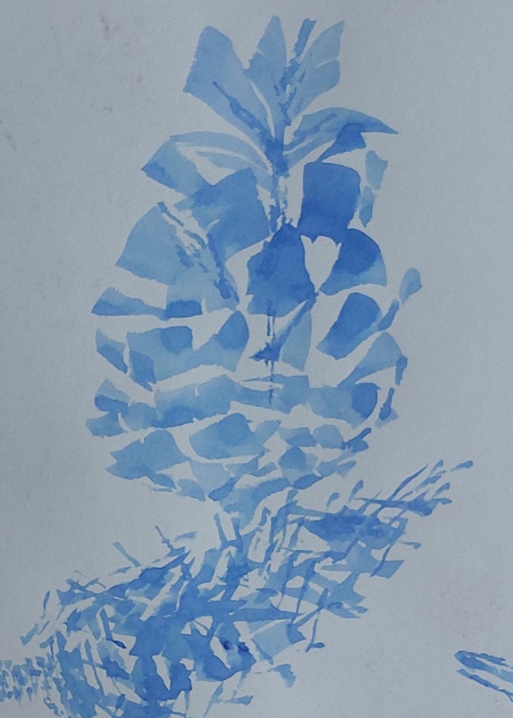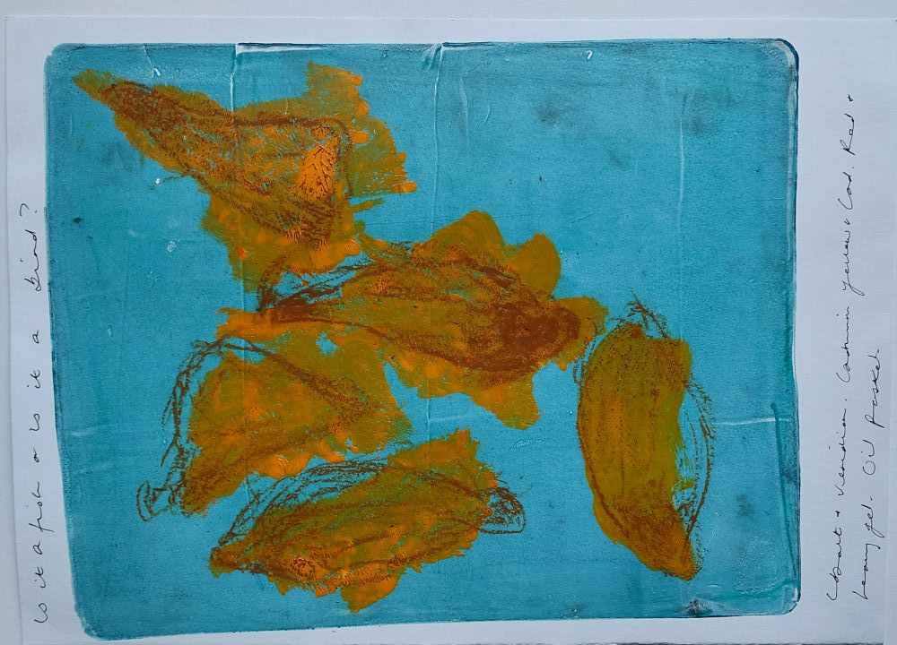 Experiment with gelli plate. Made hinge before printing. Second layer mixed up cobalt and viridian with heavy gloss gel and painted onto plate then lifted print. Added shapes with oil pastel . Very rough and ready but first attempt at abstracting from pine seeds in paint (neither fish nor bird but congruent outline).