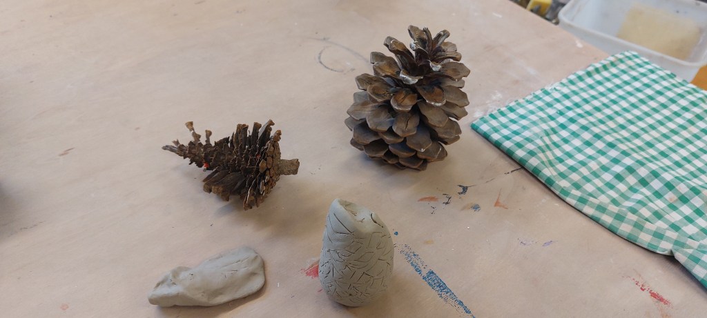 Within the available time, the probem of risking individual scales falling off without a secure centre was solved by not attempting this. Instead, I made a flat plate to represent the incipient pine cone I imagined as an actual presence hidden within the structure -something like a representation of a latent form – and a solid shape resembling the overall shape of the cone. The flat plate was too thin and as the clay dried, one end fell off. The entire cone was more successful in that it was capable of standing unsupported and once decorated with incisions was a satisfying abstraction from the reference object.