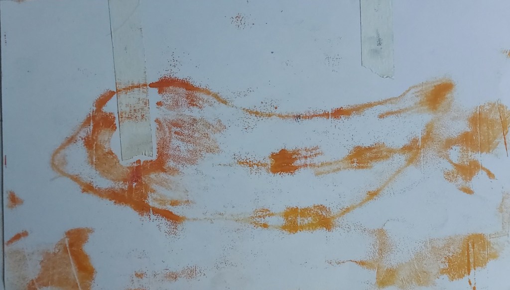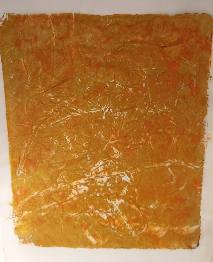 Strands of hay applied to yellow ochre rollover on tracing paper. Hay pulled off and second layer cadmium orange with more hay applied. Took longer to dry and became wrinked, leaving areas uninked as wet paint ran off the imprints of hay. When dry put between pages of sketchbook and it flatened out again. Considering whether to draw on top using inked newsprint, maybe one large drawing over the whole.