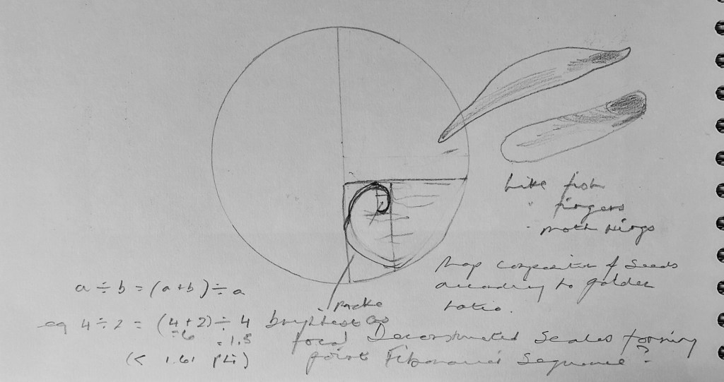 Frustration with problems of composition. Daunted by drawing out actual Fibonacci spiral as I’m no good with maths and anyway can be done later once I know more about what I’m looking for and why.