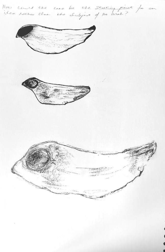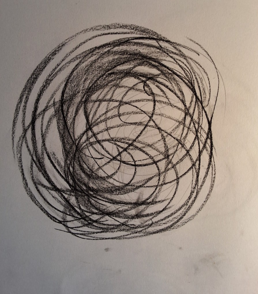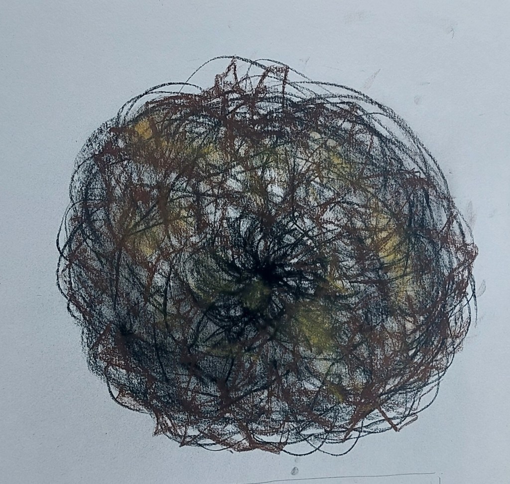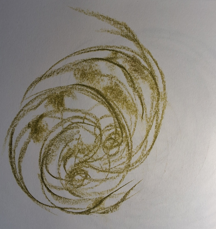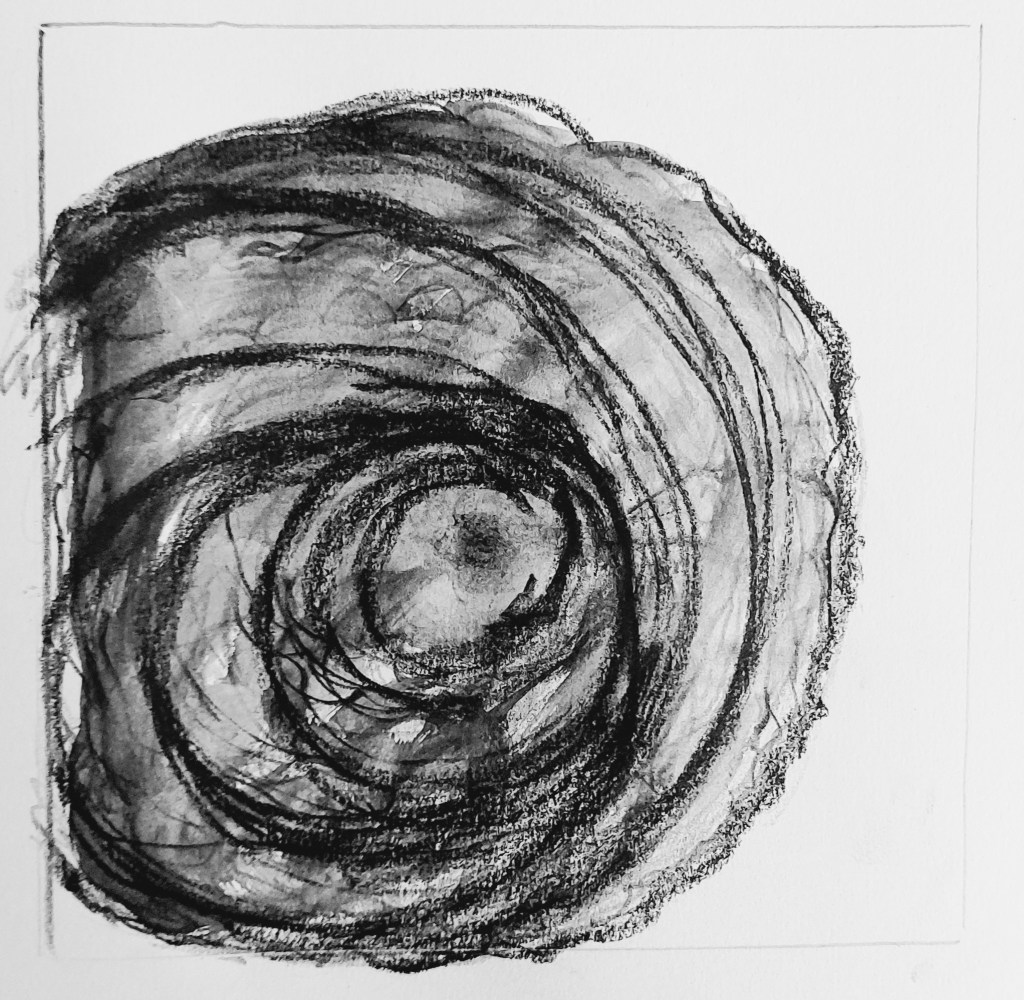 Not liking anything so just made marks hoping for a more dynamic feel. The drawing on the right is my favourite so far. Conte crayon applied heavy and light in spiral movements of whole forearm, imagining looking through the cone from the bottom with light filtering through from the top. Enjoying the physicality of the piece and want to work on this more, once I have explored more graphic approaches to printmaking through etching.