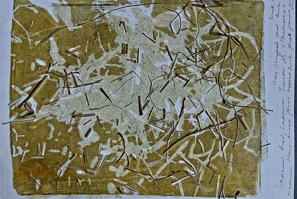 Mixed ultramarine with the cadmium red, cadmium yellow mix left on palette and added a little acrylic medium. Snipped thick and thin bits of hay to resemble needles and sprinked semi-randomly over plate. Rolled over and pulled print (having registered the paper). Too white in the middle so rolled the same hay on plate again and lifted ghost print on top of the first layer. Some of the hay stuck on the paper so decided to keep it there and brushed over diluted pva to glaze.