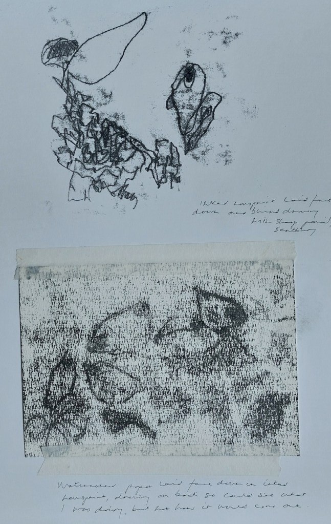 1,First print was inked newsprint laid face down on the paper and blind pencil drawing on the back. Second print on watercolour paper laid face down on the inked newsprint. This time I could see what I was drawing but not how it would turn out. The watercolour paper does not take up the ink nearly so well but I needed to see what effects would be achieved. Random patterns in the grain of the paper – like the fuzzy appearance.