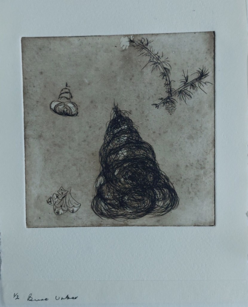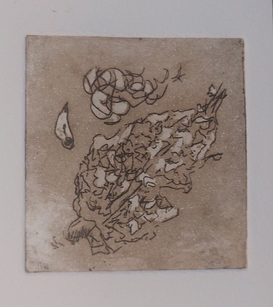 The initial deep etch was 15 minutes, followed by removal of the ground, degreasing and applying aquatint using the compressor. Areas were then stopped out to create varying tones. Several problems/flaws with the processing of the plate became very clear.
