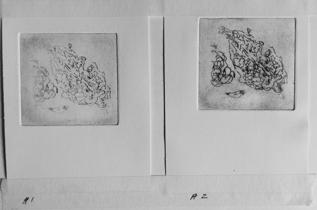 Very informative and experimental, discovering the possibilities of the medium. Trying linear and tonal effects with some stopping out. Not happy at all with the quality of the images or the composition but I deliberately drew very different kinds of images onto the plate to get a taste of what would happen in each case – a very valuable experiment. Have reflected on both the process and the outcome and think it possible that clearer, more graphic lines would be more appropriate at this early stage. Will try again during the week.