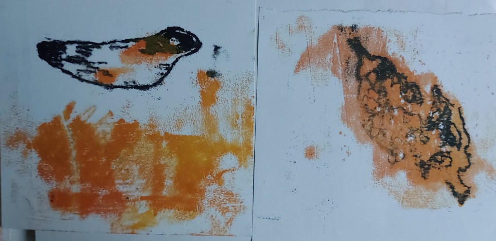 Tried more experimenting with monoprint using coloured ink. This time tried inking the plate and tracing over image – not so successful as inking paper and turning it upside down onto paper as far messier and less precise.