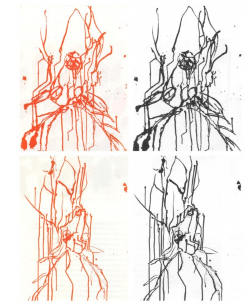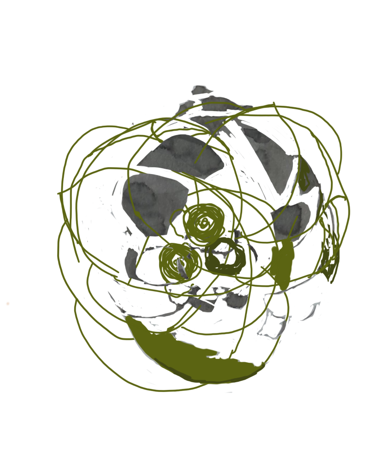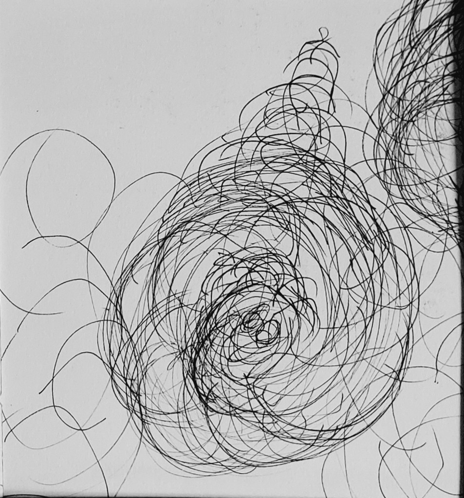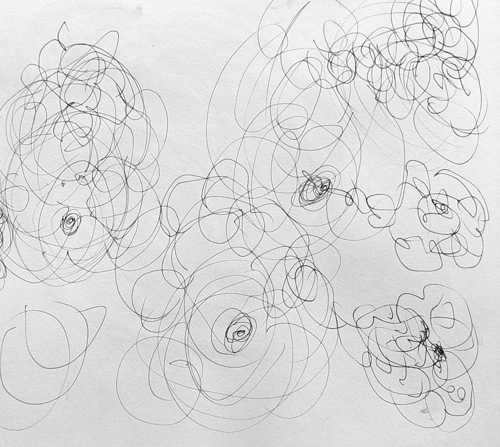 The image on right was a brush and ink drawing uploaded to Sketchbook. It was then manipulated, adding linear spirals, deleting sections and adding colour. The scribbled circles in the centre remind me of Margaret Macdonald’s rose motifs.