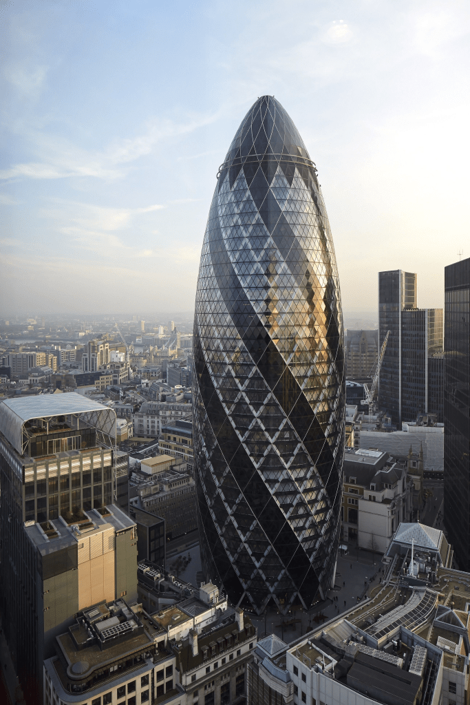 The Gherkin, London, 2003 (Foster and Partners) more closely resembles a pine cone than a gherkin