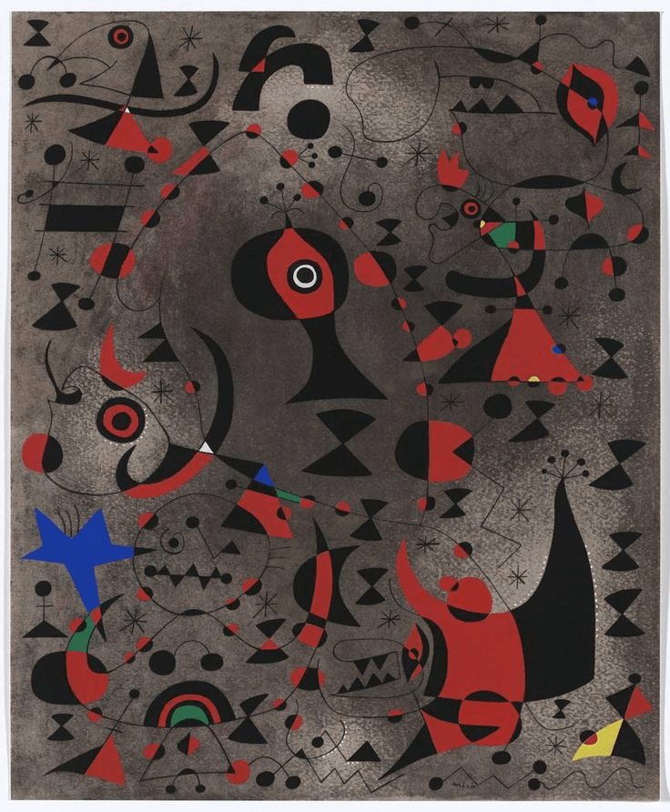 [The series of paintings) were based on reflection in the water. Not naturalistically — or objectively — to be sure. But form suggested by such reflections. In them my main aim was to achieve a compositional balance. It was a very long and extremely arduous work. I would set out with no preconceived idea. A few forms suggested here would call for other forms elsewhere to balance them. These in turn demanded others. It seemed interminable. It took a month at least to produce each water color, as I would take it up day after day to paint in other tiny spots, stars, washes, infinitesimal dots of color in order finally to achieve a full and complex equilibrium. — Joan Miró 1948.