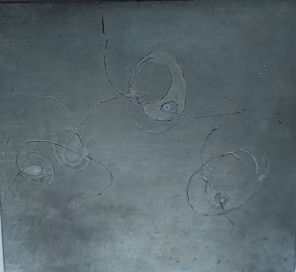 - The use of aquatint is poor. I think I should have stopped out the entire plate apart the very lightest centre cirlce for the first aquatint etch). Instead, I added stop out once for the very centre (then etched 30 seconds) and again for parts of the outer circles (1 minute). Other parts were intended to be much darker – I should have re-etched with aquatint at least four times and probably for a total time of about four minutes in order to get the darkest darks. only twice – I think it should have been etched at least three times and for a total of a five minutes.