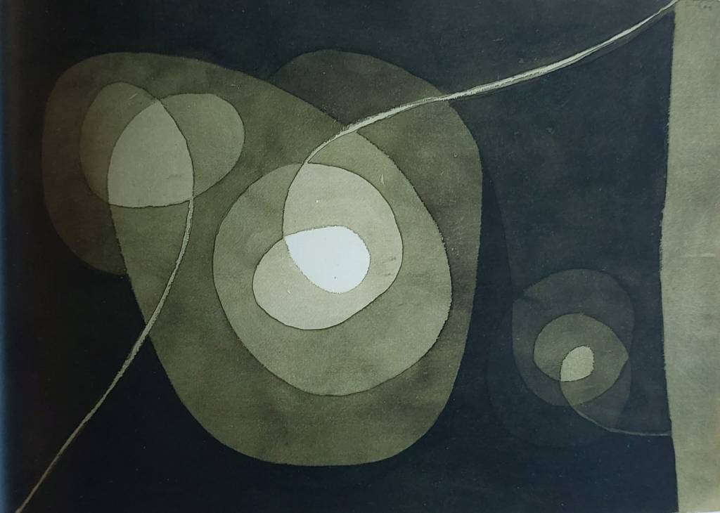 Left over paint from print, applied in broad strokes, lines drawn in soluble graphite. Thinking spontaneously of composition of objects as shapes emerged.