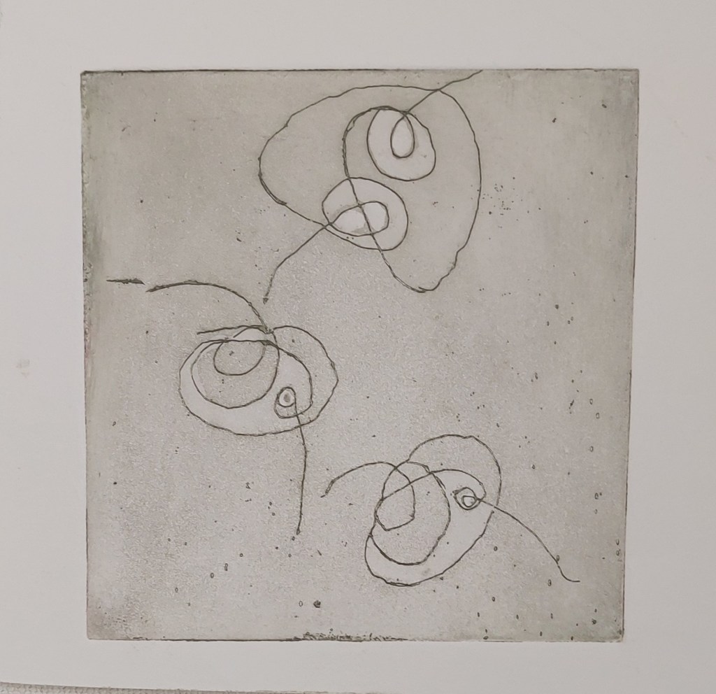 - The use of aquatint is poor. I think I should have stopped out the entire plate apart the very lightest centre cirlce for the first aquatint etch). Instead, I added stop out once for the very centre (then etched 30 seconds) and again for parts of the outer circles (1 minute). Other parts were intended to be much darker – I should have re-etched with aquatint at least four times and probably for a total time of about four minutes in order to get the darkest darks. only twice – I think it should have been etched at least three times and for a total of a five minutes.