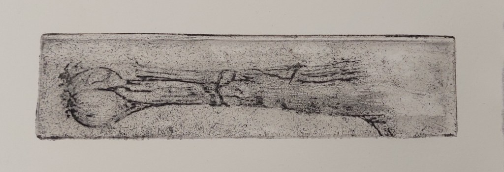 I then made the drypoint. When it was done, I rubbed over it lightly with charcoal to check the whole image was complete as it was difficult to see in the light.