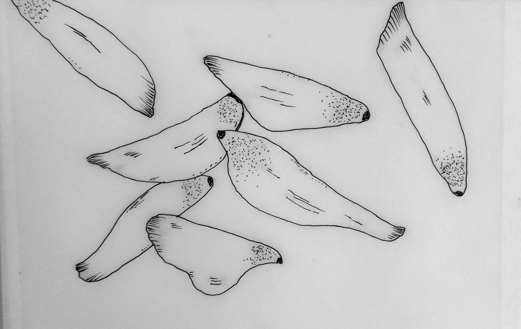 Two examples of exploratory fineliner sketches. I made several of these and began to investigate abstracting from the pine cone.