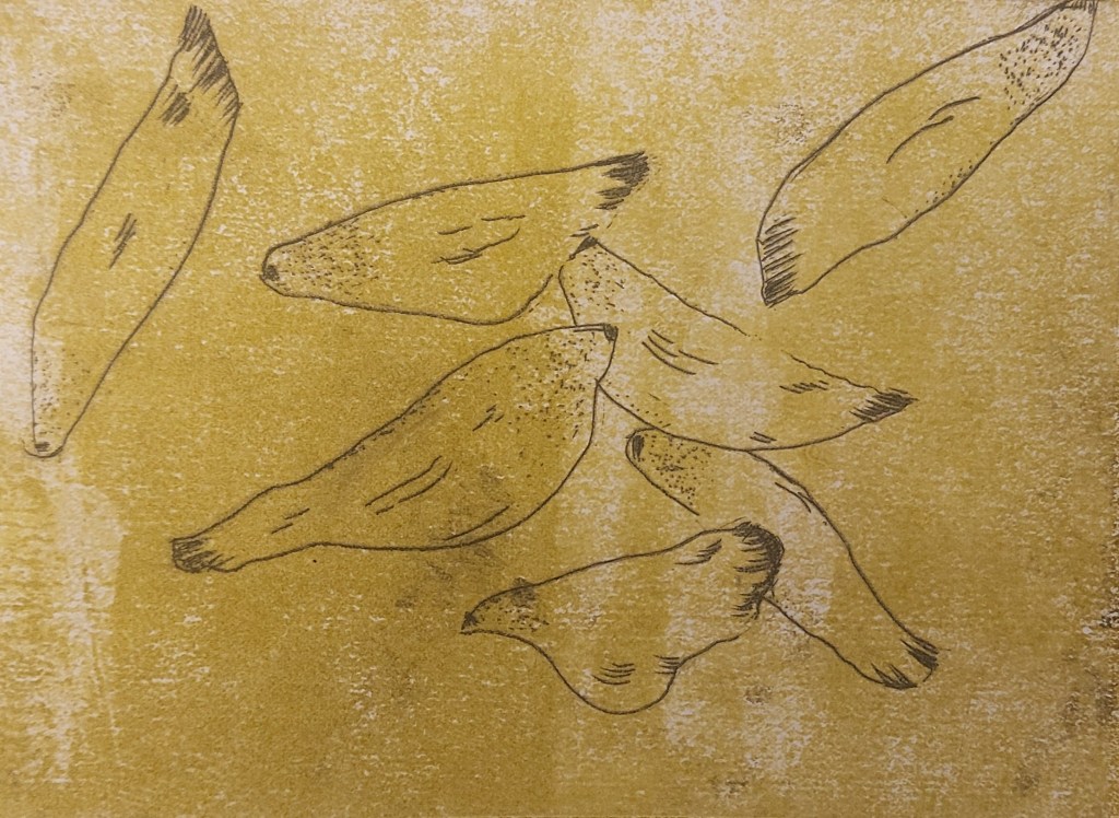 | Week beginning 27 October | Continue sketchbook work. More zinc and aquatint etching at Gracefield. Select more graphic drawings – maybe reproducing sketch of pine seeds. Buy solar plates and select images for following week – maybe drawing of pine sprig with cone. Experiment with more abstract monotype using coloured grounds and Japanese paper |